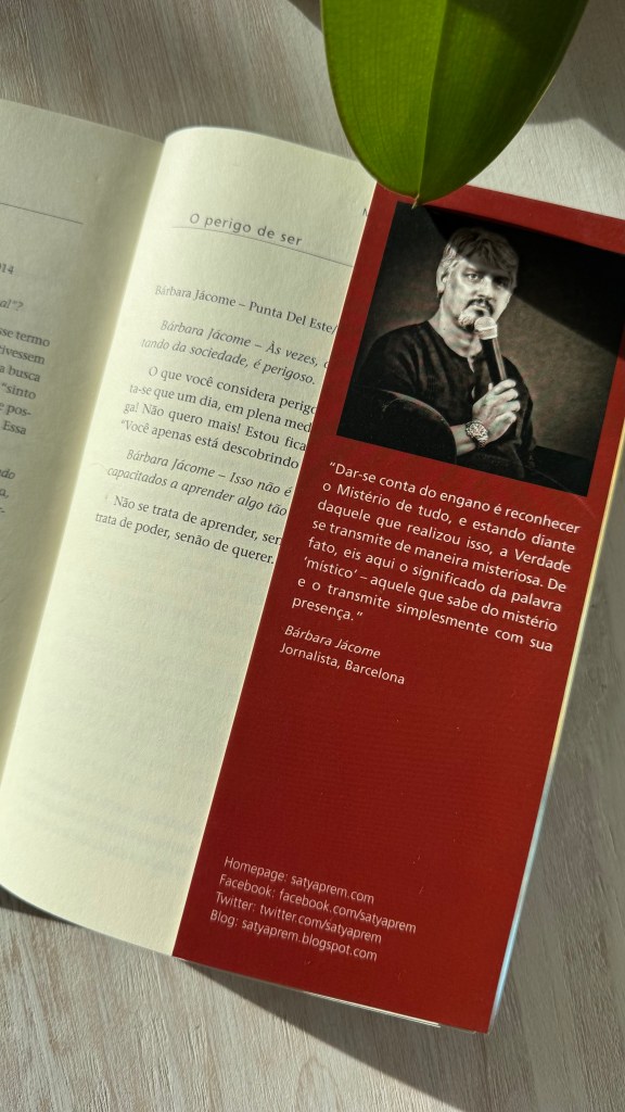 ¿Quién es Satyaprem? Maestro y discípulo del lider espiritual de SXX, Osho, de quien recibió el nombre Satyaprem. Por unos veinte años, estuvo dedicado al trabajo con terapia y meditación, actuando como parte del equipo de terapeutas de la Osho Multiversity International. En el 2000 le fue revelado definitivamente el fin de la búsqueda, aquello que los sabios suelen llamar “Iluminación”. Desde entonces, Satyaprem invoca el despertar de las personas hacia su naturaleza original a través de encuentros y retiros. Satyaprem significa “Amor por la Verdad”. Además de las charlas y retiros, cuenta con 12 publicaciones editoriales, la primera editada por Paulo Coelho, y una de las más recientes “Diálogos sobre o invisivel” .